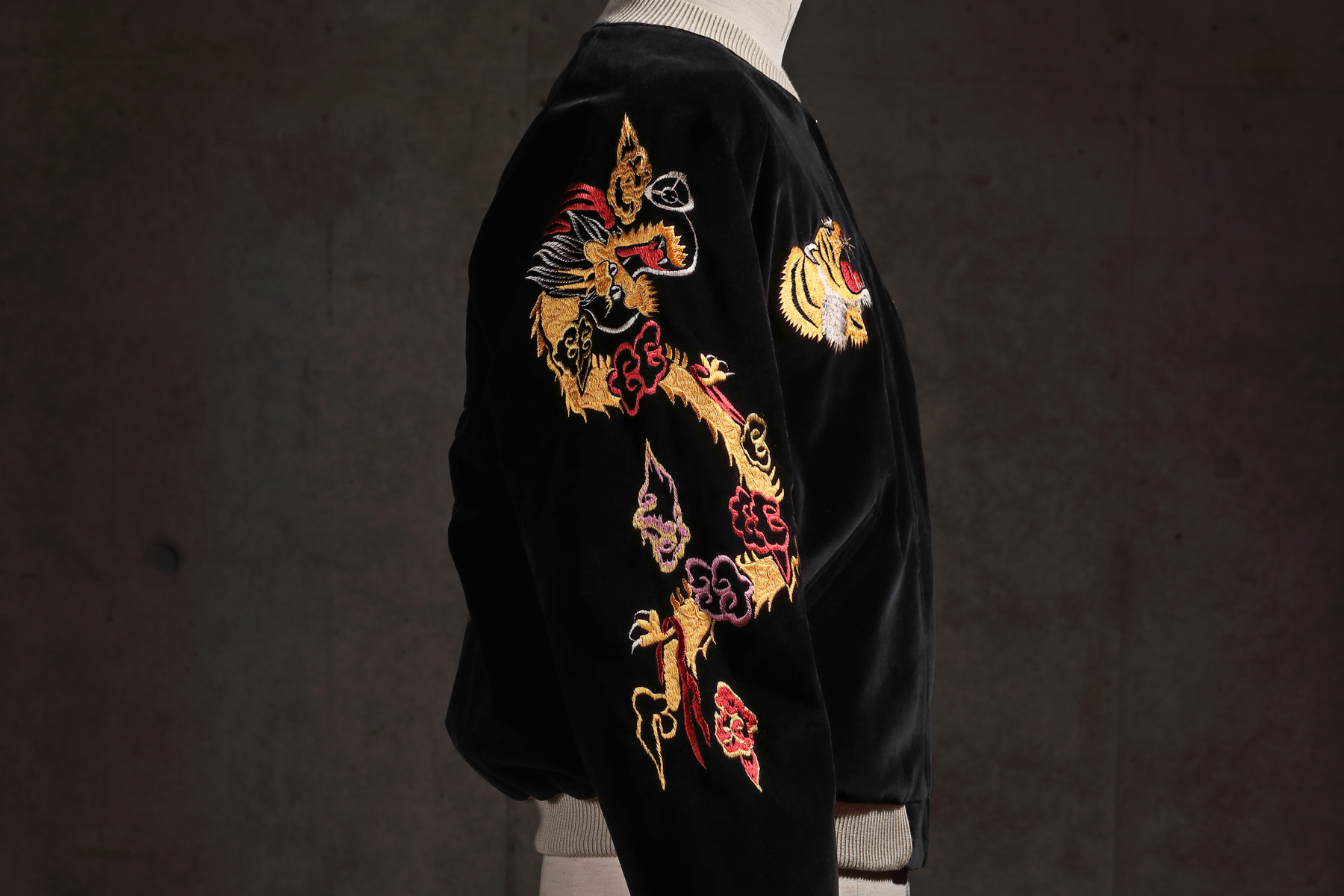「さらに最大の特徴は、袖を所狭しとうねる龍の刺繍です。オリジナルとなる個体は1950年代中期に作られたものですが、状態が良く褪色もほぼ見られません。袖の龍の迫力も相まって、この華やかな刺繍の魅力を再現する時機を長年見計らってきましたが、本作の特別感や豪華さは新年の幕開けを祝う初売りに相応しいと考え、このタイミングでの復刻に至ったのです。テーラー東洋では経年で美しく褪色した刺繍を再現することも多いですが、本作ではもとにしたヴィンテージの魅力を尊重し、鮮やかな発色を心がけました」