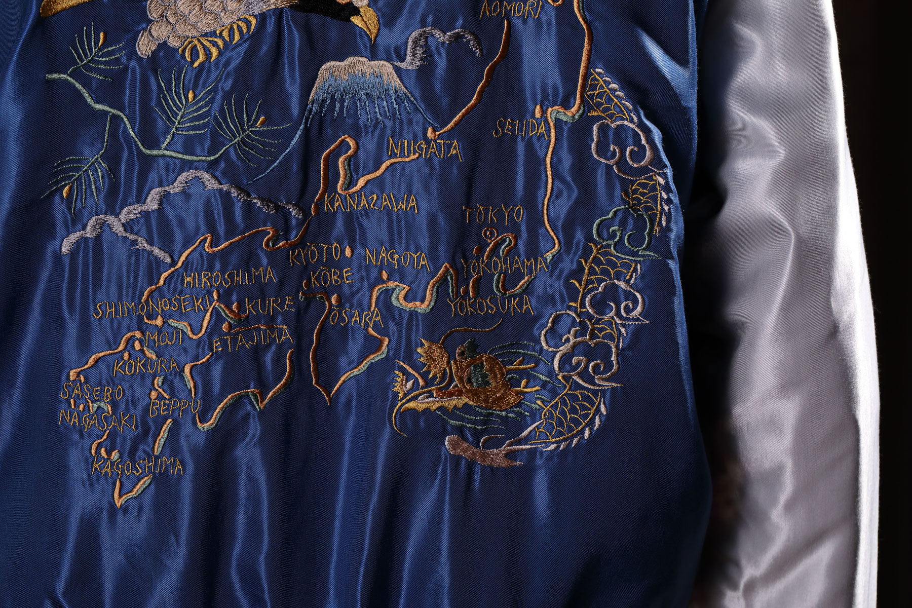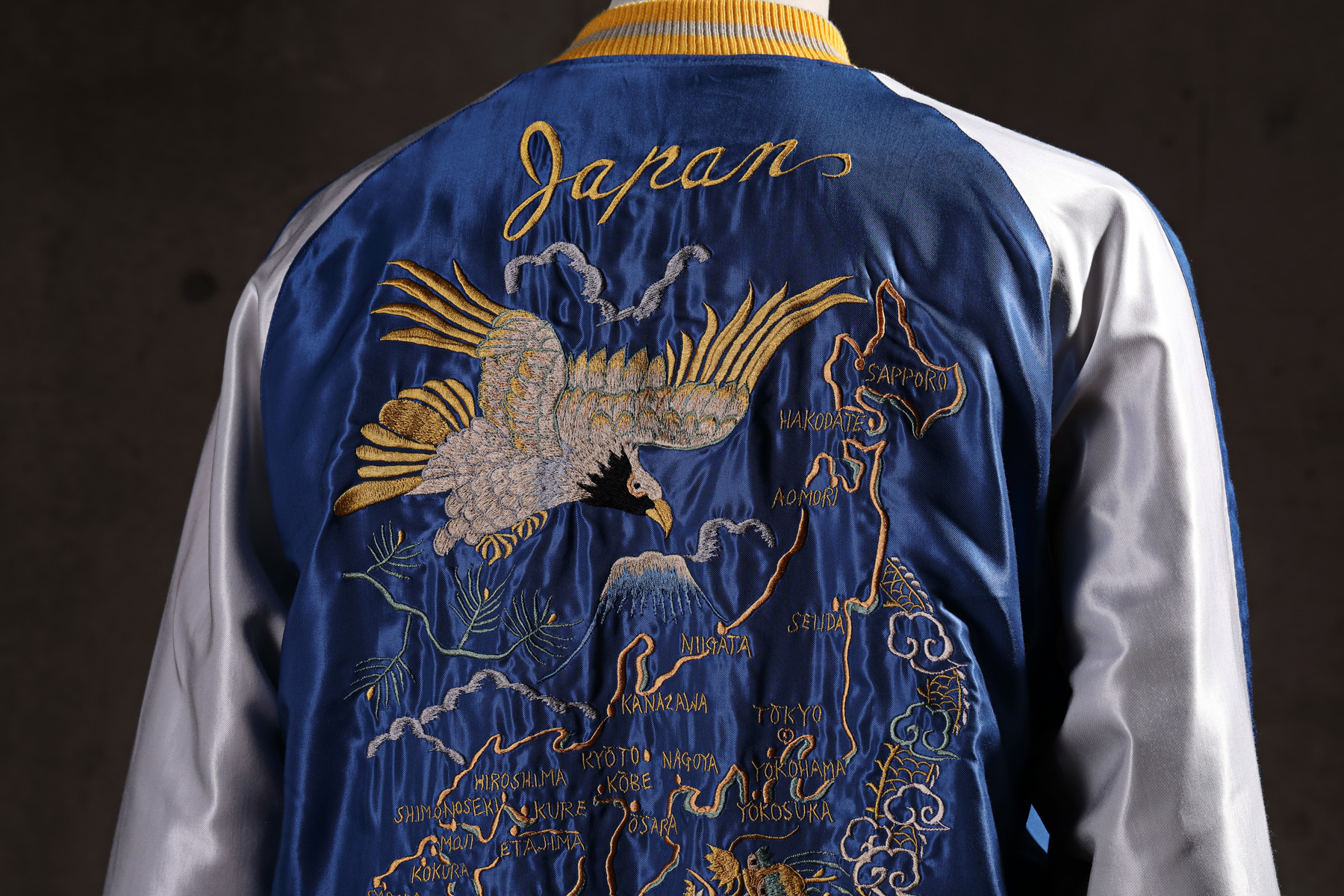 表面の龍虎の刺繍に対し、リバーシブル面は日本地図をメインにした通称ジャパンマップ柄。青空や大海を想わせるブルーのサテン生地のボディに、イエローを基調とした刺繍とリブのコントラストが映える。さらに、マップと共に描かれる鷲は一般的にデフォルメされることが多いが、本作の鷲は緻密な刺繍で翼のグラデーションまで写実的に描かれており、マップ上部に堂々と君臨して主役級の威厳と存在感を放っている。ジャパンマップ柄のなかでも特に秀逸で豪華な一着と言えるだろう。